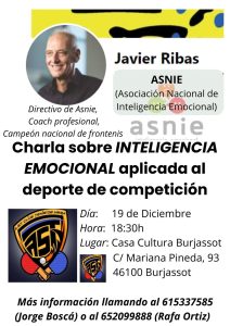 La sesión será impartida por Javier Ribas, directivo de la Asociación Nacional de Inteligencia Emocional (ASNIE), coach profesional y campeón nacional de frontenis. Su intervención profundizará en el papel clave que desempeña la gestión emocional en el rendimiento deportivo, abordando aspectos como la toma de decisiones bajo presión, la autoconfianza, la motivación y la regulación emocional en situaciones de competición.
