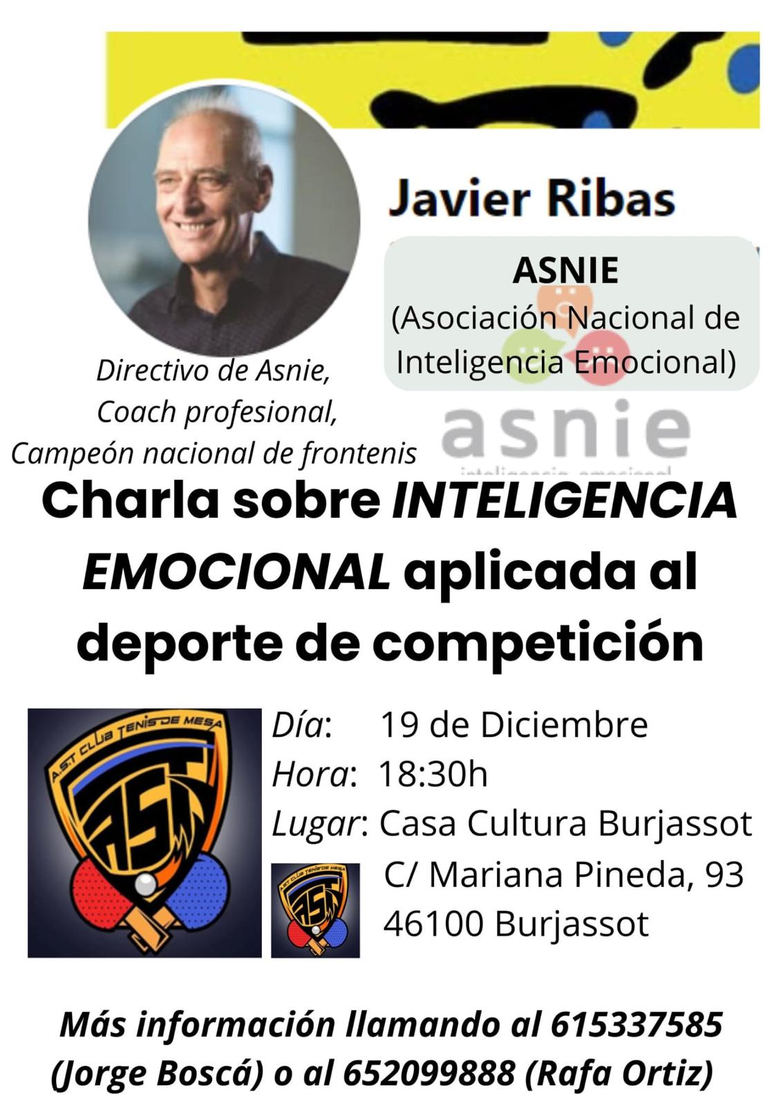 La Casa de la Cultura de Burjassot albergará el próximo 19 de diciembre una conferencia dedicada a la inteligencia emocional aplicada al deporte de competición, una iniciativa impulsada por el AST Club Tenis de Mesa y abierta de forma gratuita a todas las personas interesadas en asistir.